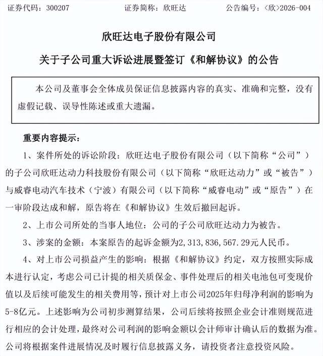 此次和解预计将对欣旺达2025年归母净利润产生5亿元至8亿元的影响,最终金额以审计数据为准。